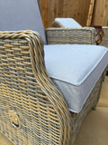 The Oatmeal-coloured all-weather rattan weave gives the set a contemporary yet timeless look, perfectly complemented by light grey cushions that are as stylish as they are comfortable. Crafted with a rustproof aluminium frame and durable synthetic rattan, this reclining garden furniture set is built to last in all outdoor conditions.