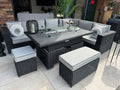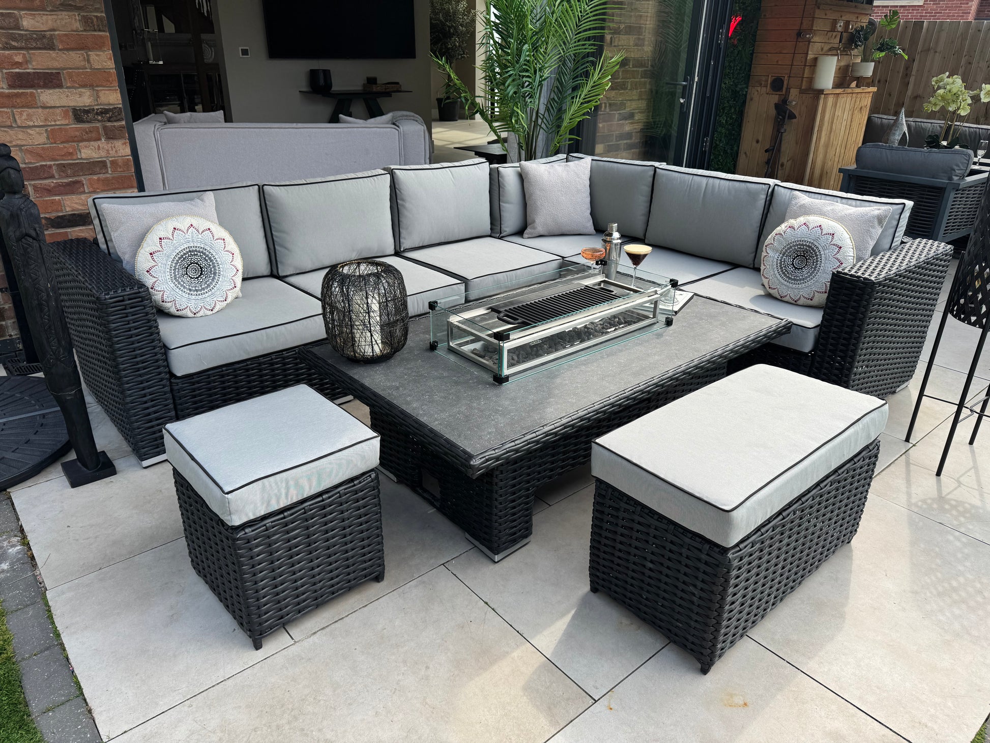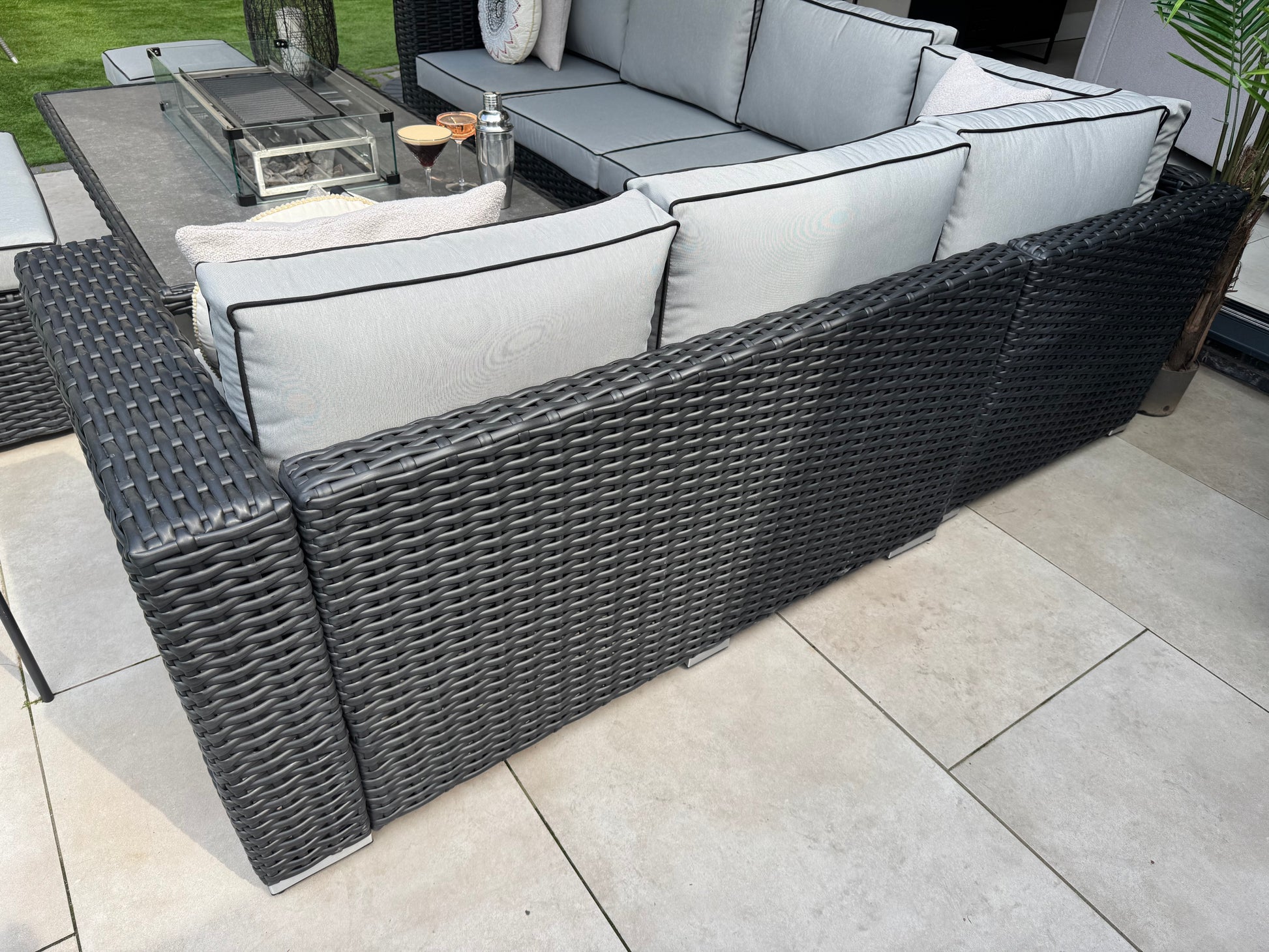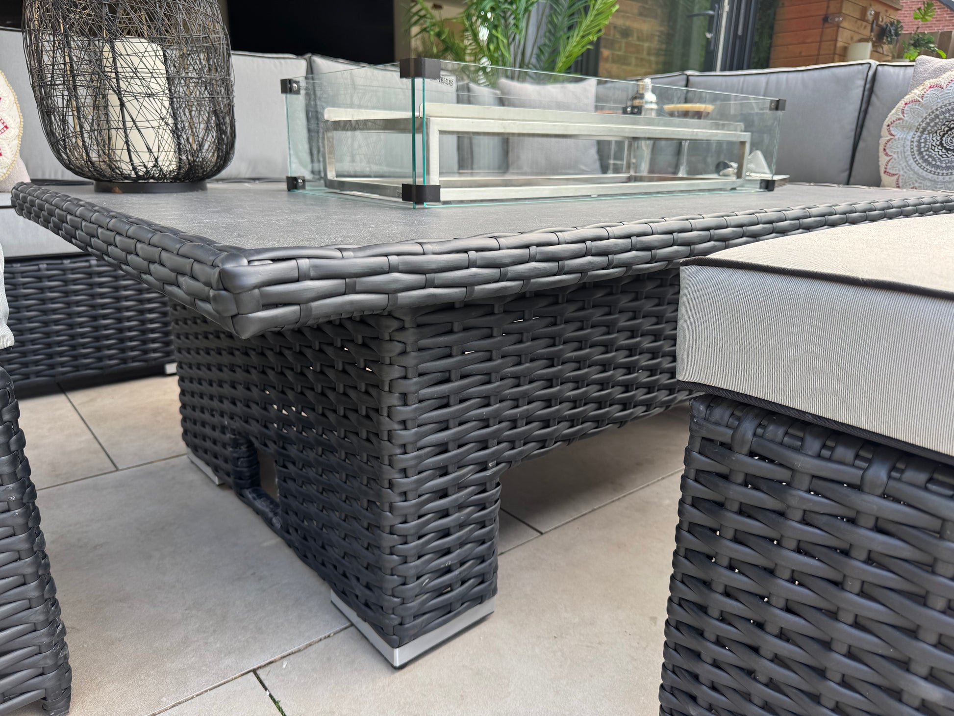 Santa Monica Black Edition Corner Sofa with Rise and Fall Fire Pit Dining Table - Bundle Buster Sale - INCLUDES FREE PARASOL WITH WEIGHTS AND FREE COVER!
